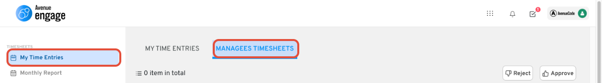 - After the log-in in Engage click on the "My Time Entries" menu option under the "Timesheets" menu group.
