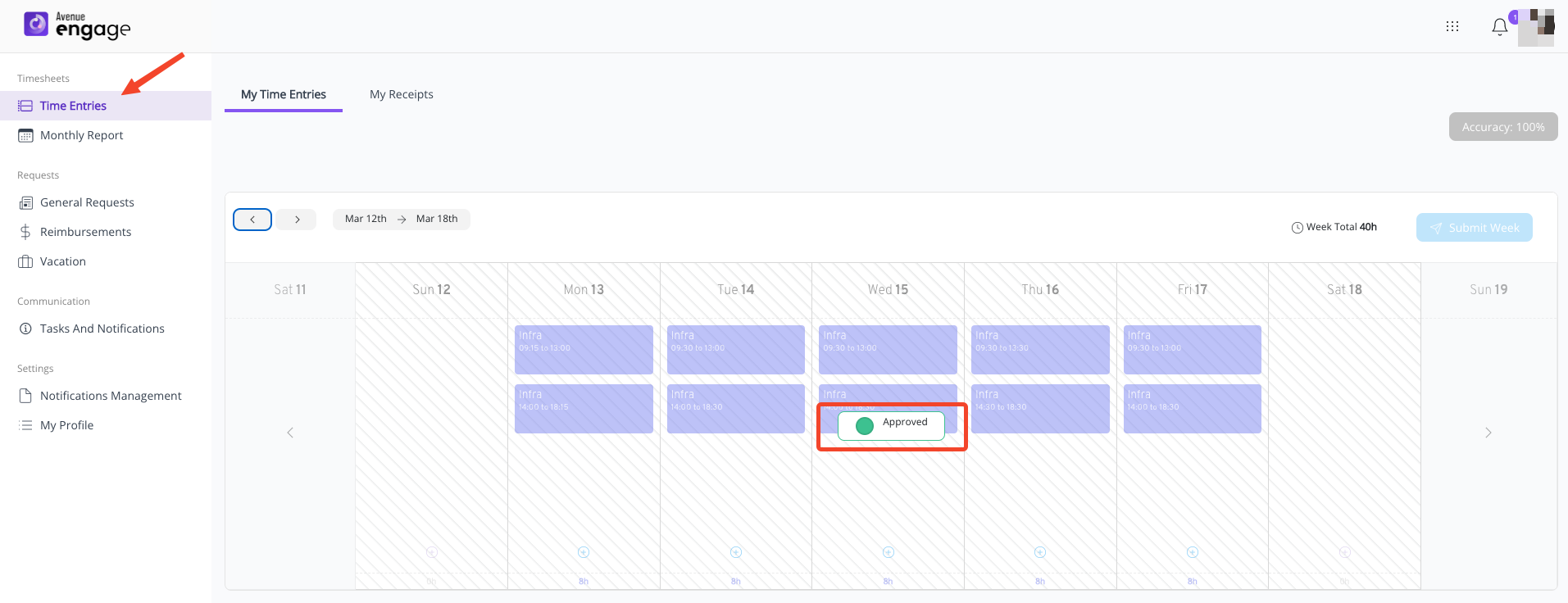 Step 1: Check if all weeks of that month have been submitted and approved by accessing the menu: Time Entries > My Time Entries