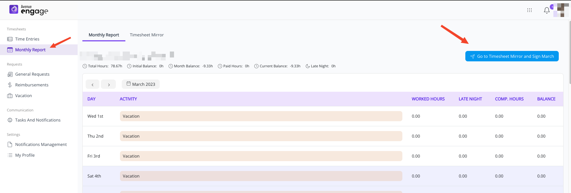 Step 2: Access the "Monthly Report" menu, select the correct month, and click "Go To Timesheet Mirror and Sign Month"