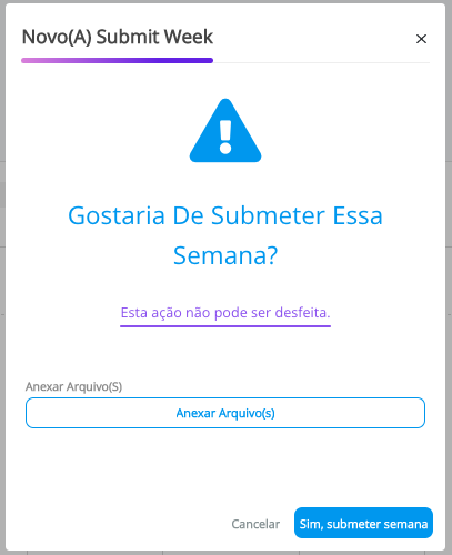 - No momento que clicar para submeter um modal de confirmação será exibido, clique em "Sim, submeter semana" para enviar a semana para revisão do seu gerente.