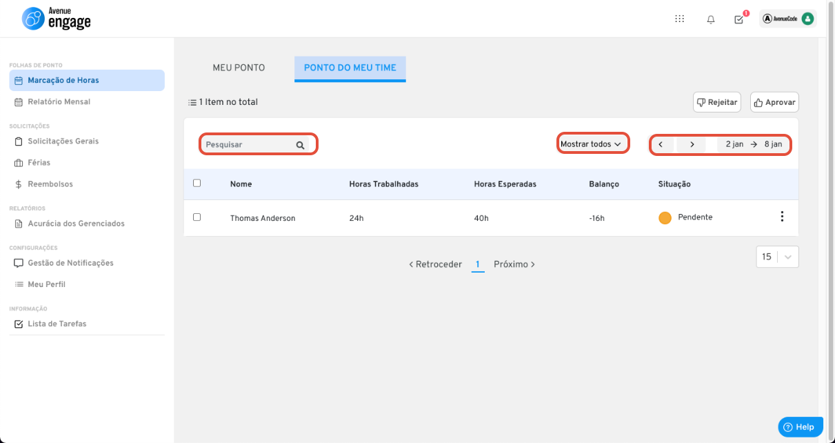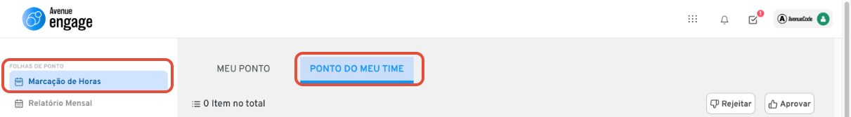 Passo 1: Selecione o menu Folhas de Ponto -> Marcação de Horas -> Ponto do Meu time