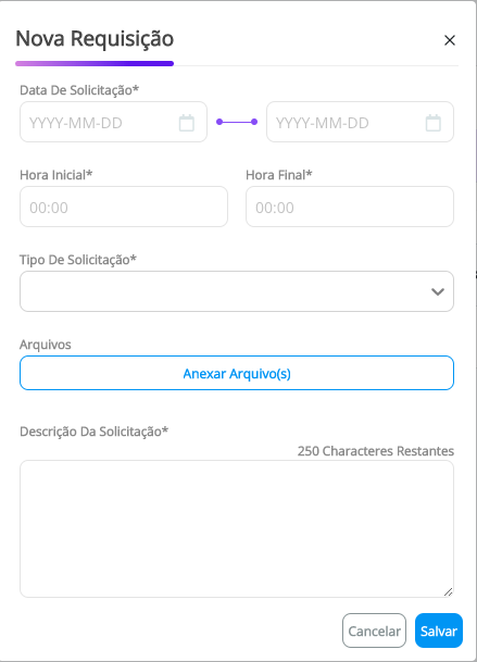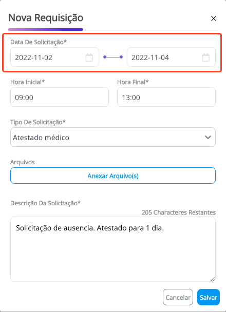 Importante: O Engage irá gerar uma solicitação para cada dia dentro do período de Início e Fim marcado. Exemplo: 02 Novembro a 04 Novembro