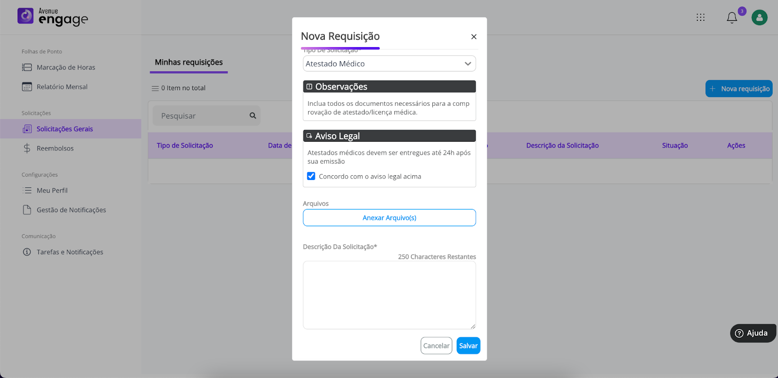 Nas solicitações gerais você pode realizar diversas requisições, como justificar suas faltas e encaminhar atestados médicos diretamente pela plataforma. Para isto: