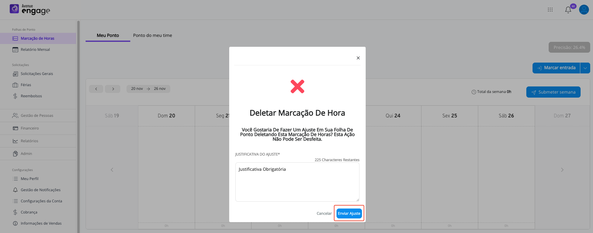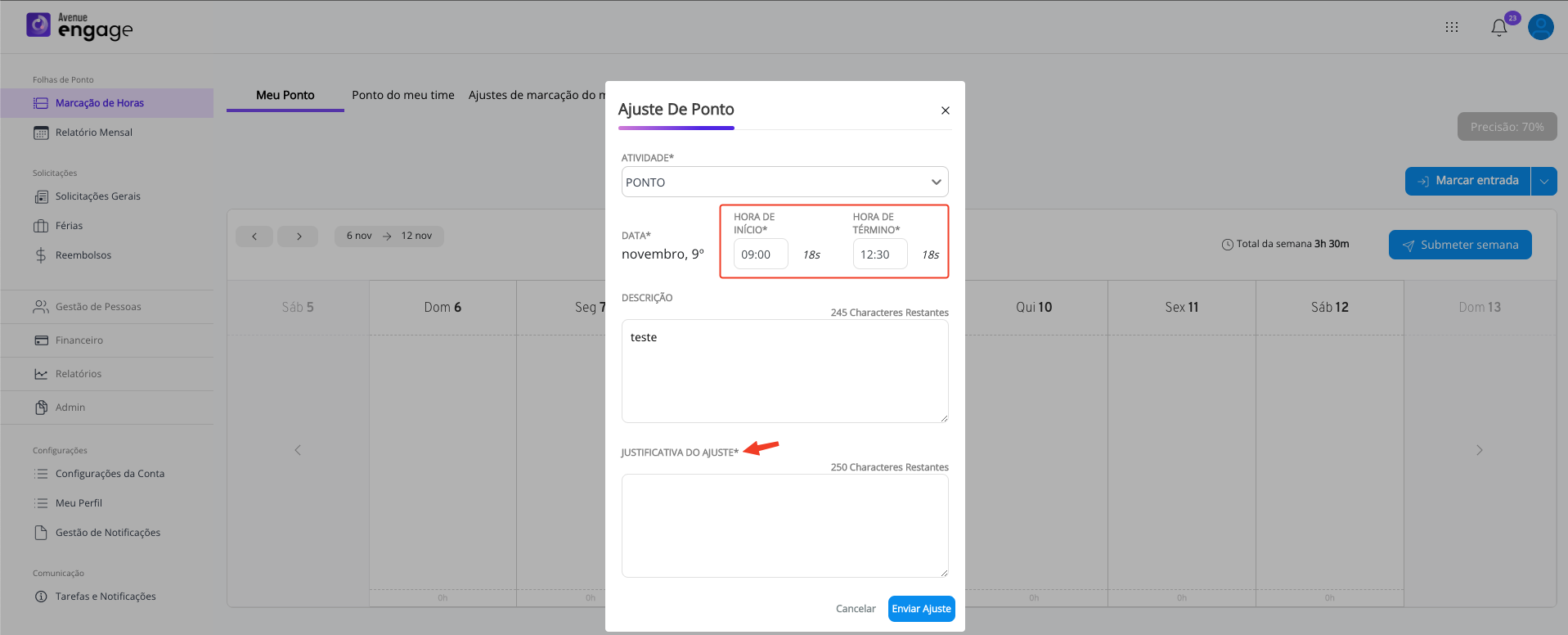 - Com o modal aberto, poderá editar de acordo com sua necessidade, e terá que justificar o porque do ajuste. Após preenchido, clicar em Enviar Ajuste.